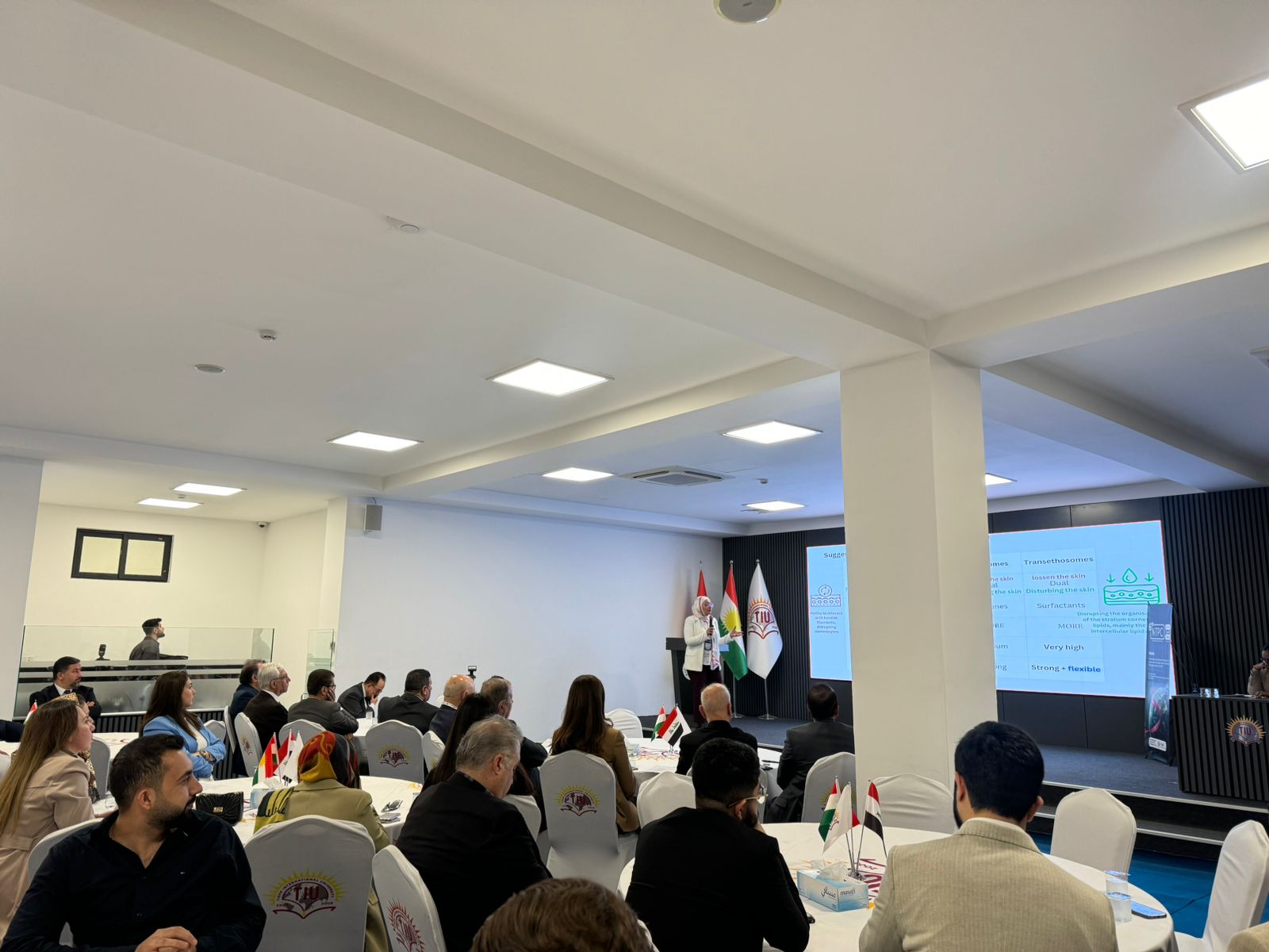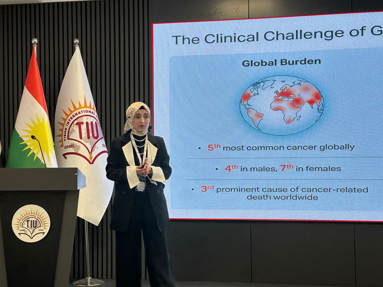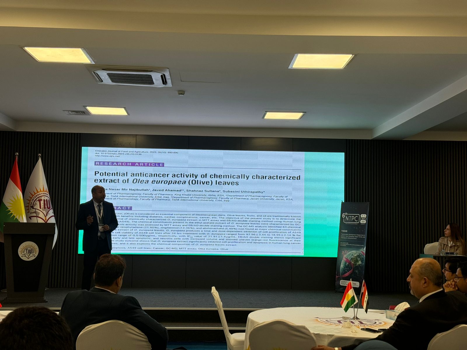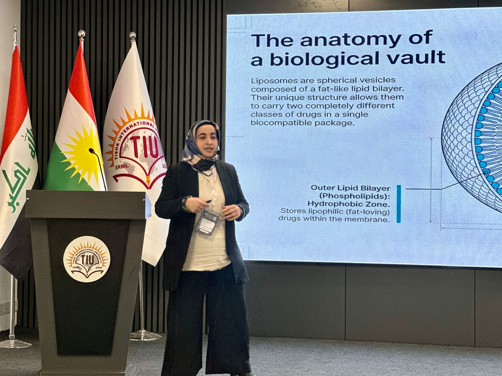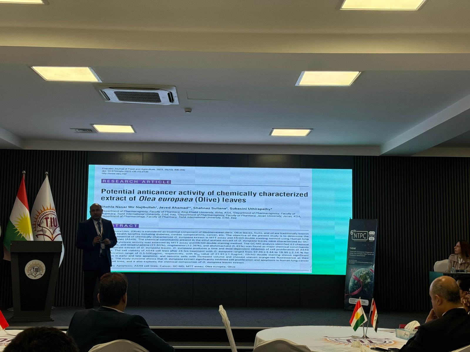 Dr. Shiva hosted the event with a wonderful speech on cancer research. Asst. Prof. Dr. Idris Hadi, Chair of the Board of Trustees, opened the conference with a motivational speech about the university’s extraordinary accomplishments and growth. Following him, Prof. Dr. Sultan Abu-Orabi, President of Tishk International University, welcomed the delegates and expressed gratitude to the organizers for holding such a prominent scientific event. Asst. Prof. Dr. Abdulsamad Salahuddin, Dean of the Faculty of Pharmacy, wrapped up the inaugural session by highlighting the conference’s importance in cancer research, academic collaboration, and sustainable healthcare. The first session featured three keynote speakers. Dr. Reem Abou Assi, gave a fascinating talk titled “Healing Beyond Pills: A Gel-Based Strategy for Breast Cancer Management,” which focused on unique medicine delivery modalities. Assistant Professor Zjwan Mohammed followed her with her presentation, “Papillary Thyroid Carcinoma: From Epidemiological Trends to Molecular and Hematological Biomarkers,” which focused on diagnostic improvements. Dr. Najmaddin Khoshnaw, Assistant Professor, spoke about “Comparative Effects of Vaping and Cigarette Smoking on Hematological Parameters in Young Male University Students,” which raised public health concerns. The second session had four speakers who discussed a variety of cancer care topics. On “Colorectal Cancer Care for the Future,” Dr. Jaafaru Sani discussed epidemiology and long-term therapeutic advances. Assistant Professor Subasini Uthirapathy presented about “Breast Cancer: Pathophysiology, Early Detection, and Modern Treatment Strategies.” Dr. Javed Ahamad, Assistant Professor, lectured on the “Role of Kurdish Ethnomedicinal Plants in Cancer Care,” while Dr. Mohammad Aslam discussed “Theranostic Agents: A Transformative Paradigm in Precision Cancer Diagnosis and Targeted Therapy.” The third session had three speakers who explored natural and innovative medicines. Dr. Ahmad Hamdy spoke about “Investigating Natural Compounds from Agarwood for Cancer Activity.” Dr. Peshawa Shafiq, Assistant Professor, spoke about “The Anticancer Secret of Kurdish Wildflowers: A Phytochemical Journey through Anchusa Species.” The sessions concluded with Assistant Lecturer Dr. Rojan Arif discussing “Liposomal Delivery Systems in Cancer Therapy.”