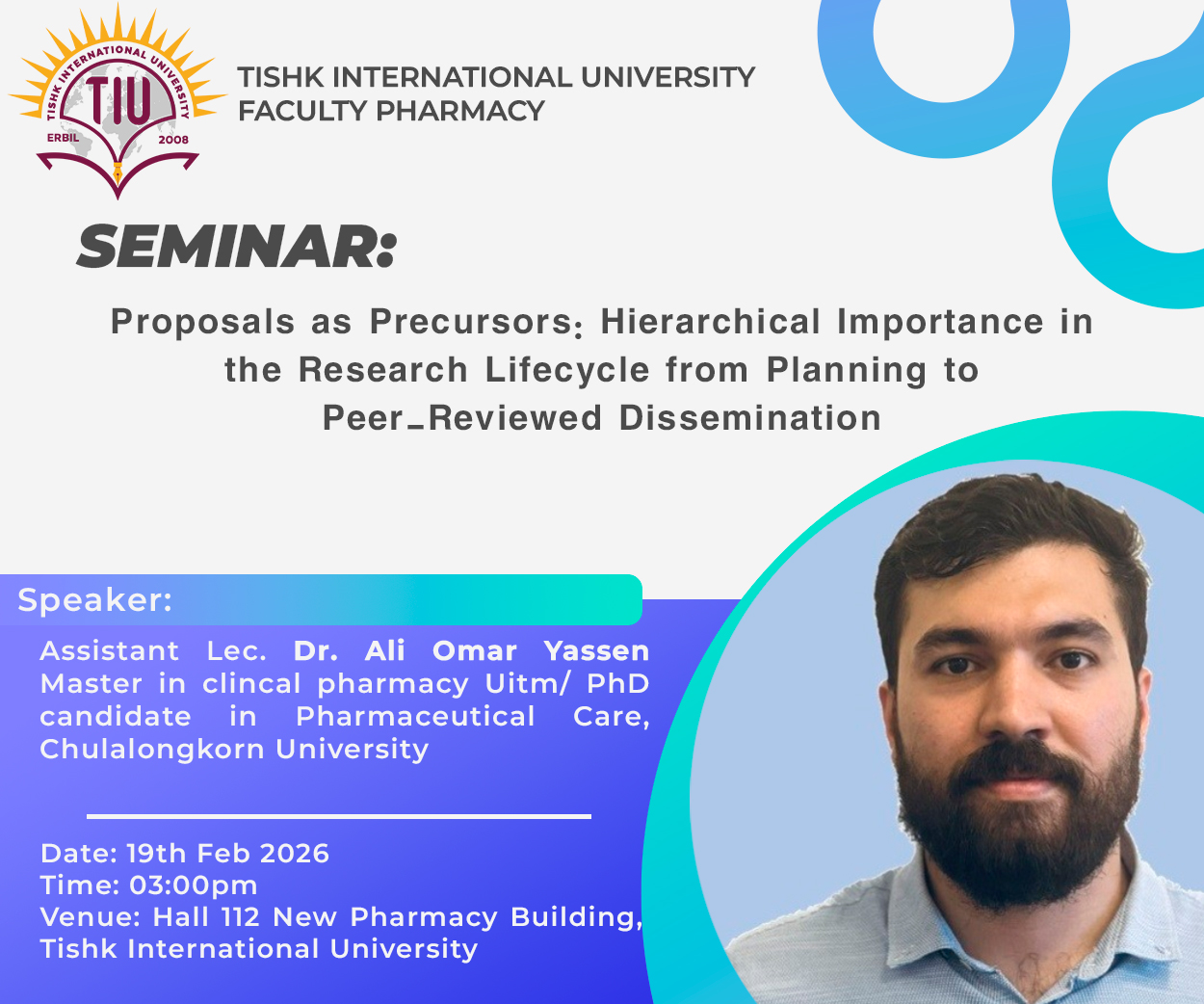 On 19 January 2026, the Faculty of Pharmacy at Tishk International University organized a scientific seminar aimed at enhancing research skills among students and academic staff supporting Quality Education and Lifelong Learning.