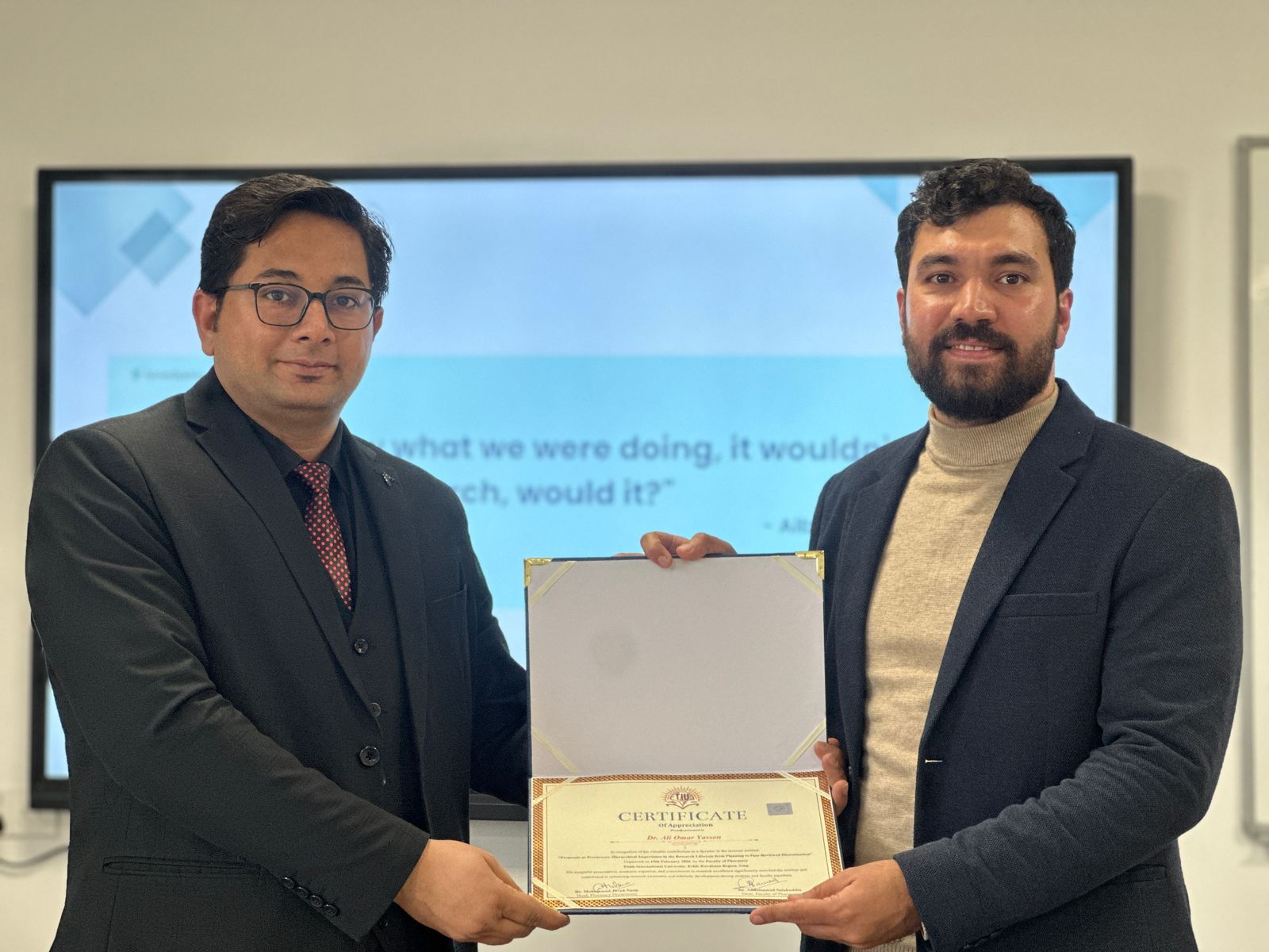 The seminar was interactive and informative, reflecting the Faculty of Pharmacy’s commitment to promoting research culture and academic development at Tishk International University. Dr. Mohammad Javed Naim, Head of Pharmacy Department, presented an appreciation certificate to Dr. Ali for his immense contribution to the field of research. The seminar was held with full support from Dr. Abdul Samad, Dean Faculty of pharmacy who always highlights and promotes such activities to upgrade the staff and students.
